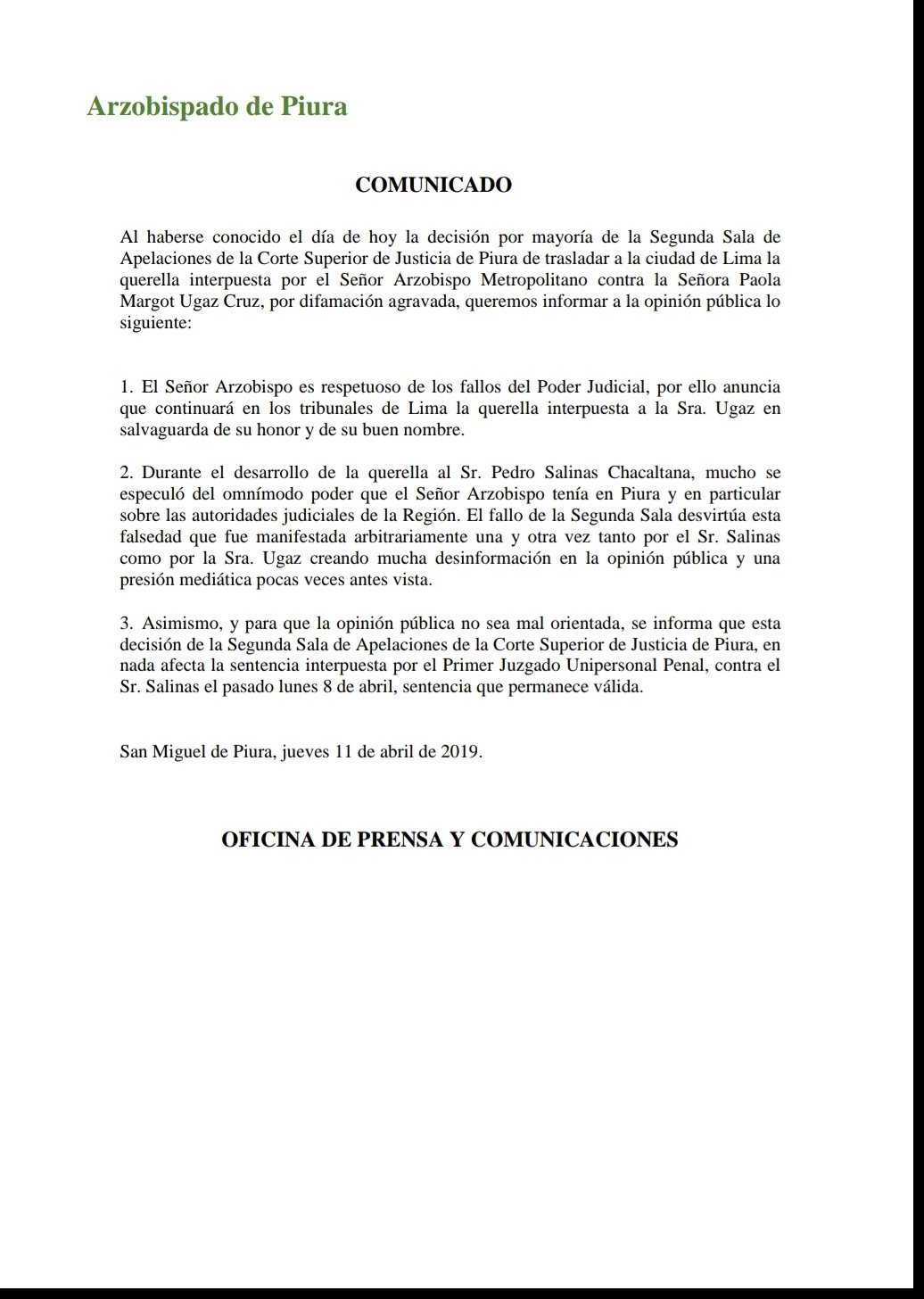 ARZOBISPO QUE GANÓ JUICIO PIDE PACIENCIA A OBISPOS QUE DEFENDIERON A PERIODISTA QUE LO DIFAMÓ